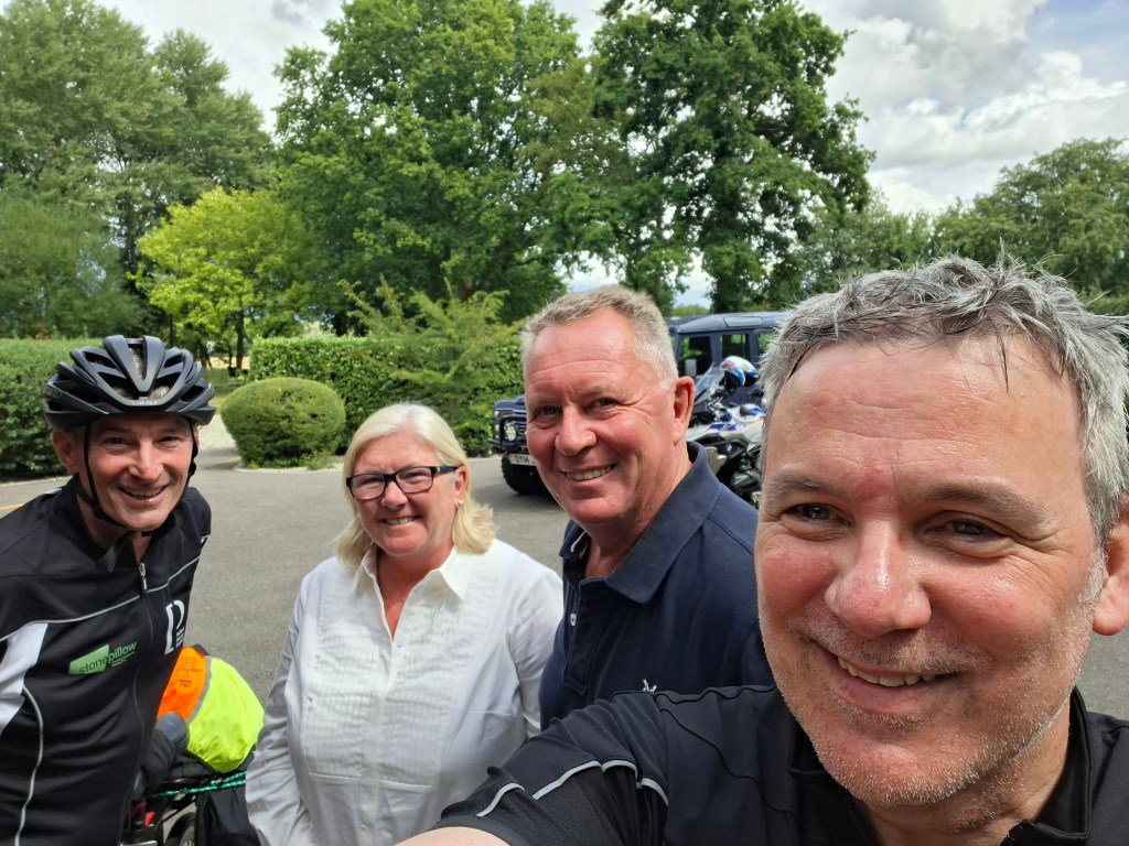 Whilst cycling behind Malcolm, I saw one of the bike rack connector arms seem to tear itself apart and send parts scattering across the road and pavement. We managed to rescue most of the parts but failed to find one of the attachments. Then a man called Graeme/Graham asked if he could help and by great good fortune, he happened to live in the house opposite. Graeme/Graham and his lovely wide George(gina) were so helpful and generous and fortune seemed to be smiling on us, as Graeme/Graham just happened to have a screw that fitted perfectly. After a Good Samaritan picture, we ventured on, finding some beautiful cycle paths and quiet roads with stunning villages. Finally, unable to hold back the rain any longer, we got doused but found shelter beneath a tree, which allowed us to test out wet weather gear – it seemed to work