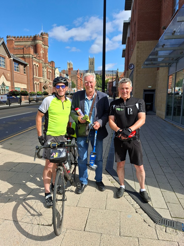 We were then led down quiet country lanes to the attractive town of Sleaford. Malcolm managed to make the traffic lights before they turned red; I did not. A couple of minutes later, I saw him on a small traffic island. Apparently, not wanting to take his foot out of his toe-clips, he had fallen onto the traffic island. Three sets of people had gone to help him. As with what he learned about his character in the interview with himself, it seems that not putting his foot down seems to be a recurring problem with Malcolm. I think Sleaford have renamed the traffic island The Fool’s Landing.